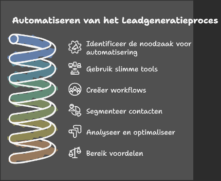 Automatisering draait om het gebruik van technologie om het proces van het aantrekken, kwalificeren en beheren van potentiële klanten te stroomlijnen. Van het identificeren van zakelijke kansen tot het versturen van follow-up e-mails – automatisering neemt veel van het handmatige werk uit handen, zodat jij je kunt richten op het omzetten van deze kansen in klanten.